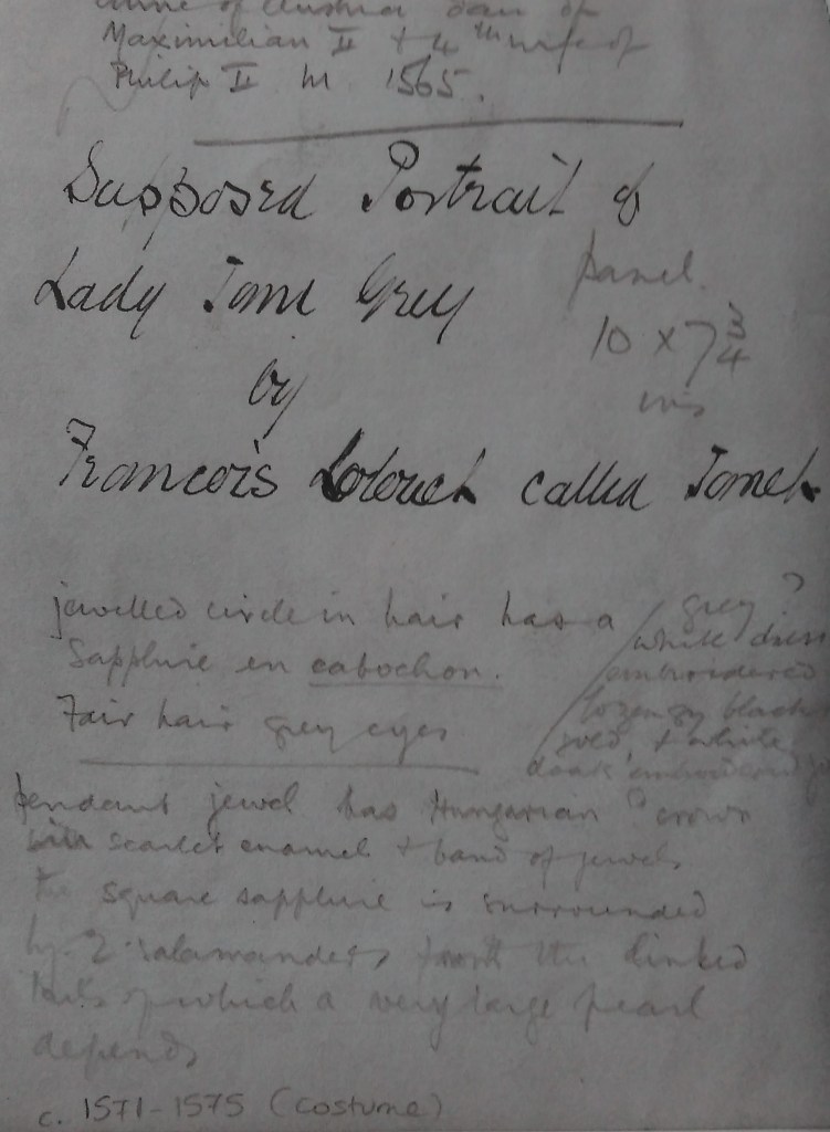 Research produced and published by Susan James in January 1996 has now established without doubt that some of the jewels worn by the sitter in NPG4451 appear in inventories made of Katherine Parr’s jewels in 1550. [12] By June of 1996, the National Portrait Gallery then opted to reidentify NPG4451 as a portrait of Katherine Parr and not Lady Jane Grey. This in turn allowed the other portraits connected with this pattern to also be reidentified as an image of Katherine Parr and the lost Jersey portrait would finally get an accurate identification.