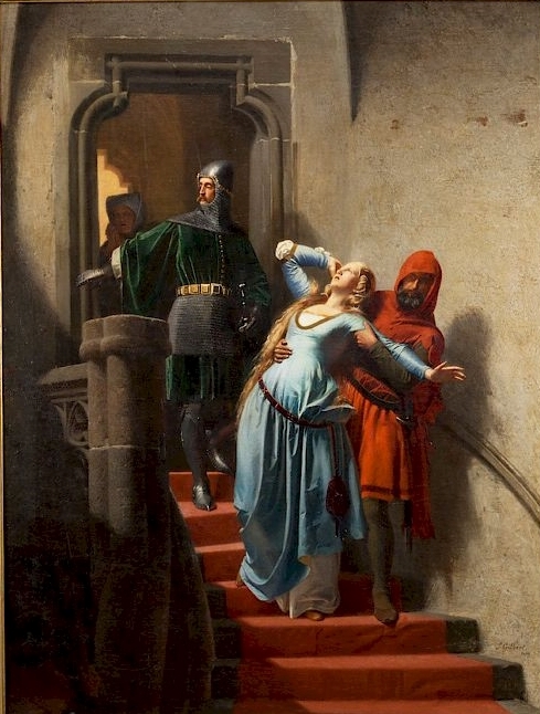 This painting depicts the helpless Jane being dragged to her prison cell by one of the guards at the Tower. The figure in chainmail seen within the door frame probably depicts John Brydges, Lieutenant of the Tower of London. The costumes worn by the sitter’s are far to early in period to have been worn by Jane Grey during her lifetime and would be more suited to a painting depicting a scene from the fifteenth century rather than the sixteenth century.